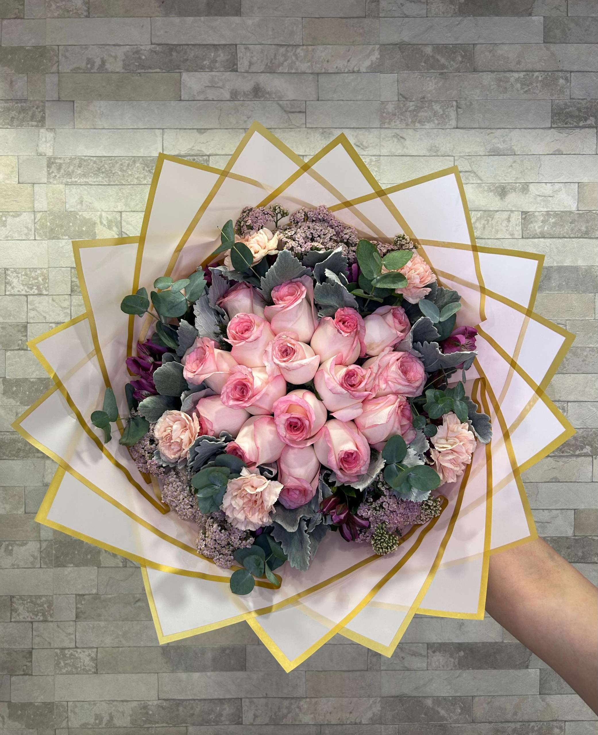 Ramo con rosa provenza color de rosa y aquilea+follaje en vuelto en papel coreano.
