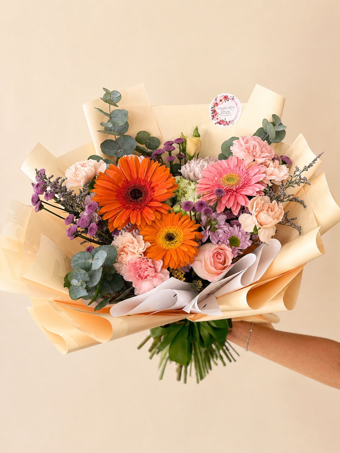 Ramo con gerberas, claveles, luneta y Lisianthus + finos follajes en vuelto con papel coreano.