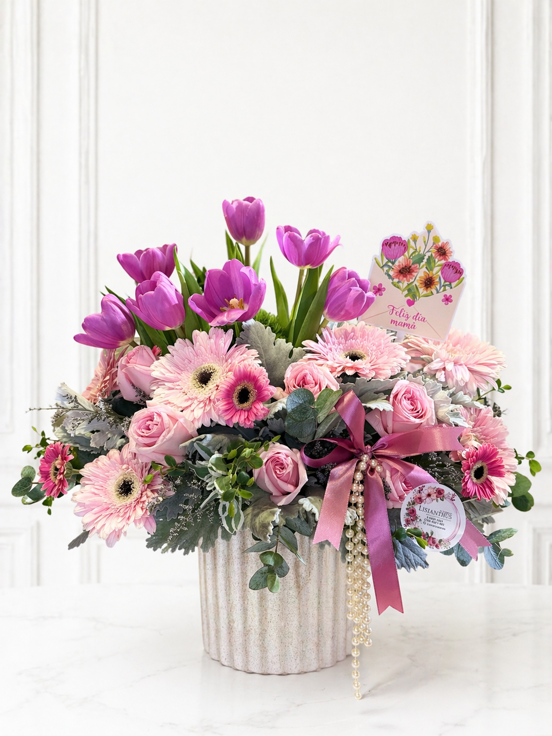 Arreglo de gerberas, mini gerberas, cenecio y tulipanes en base de cerámica
